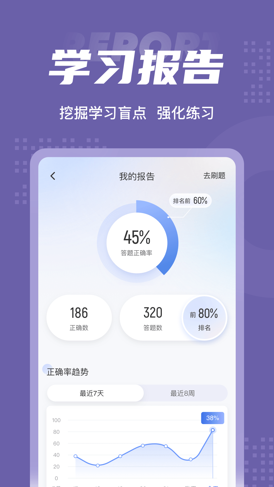 2.模拟考试功能:系统根据真实考试流程设计的模拟测试,让用户在模拟训练中提前感受考试氛围,测试结束后提供综合分析报告,精准评估考生的水准。